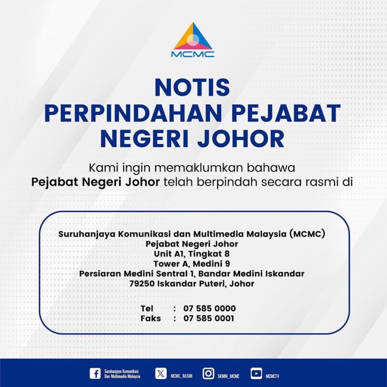Sukacita dimaklumkan bahawa MCMC Pejabat Negeri Johor telah berpindah secara rasmi di: Unit A1, Tingkat 8, Tower A, Medini 9 Persiaran Medini Sentral 1, Bandar Medini Iskandar 79250 Iskandar Puteri, Johor Sebarang urusan dan pertanyaan sila hubungi: Tel: 07 […]